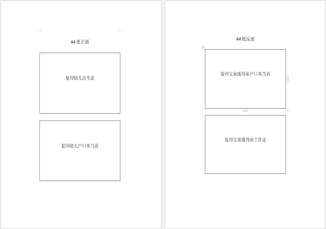 办理入园手续时,家长需携幼儿出生证明原件及复印件、幼儿户口本当页复印件、父亲或母亲户口本当页复印件、父亲或母亲本人工作证复印件(以上资料请提前使用A4纸依次进行双面复印,复印模板附后)。