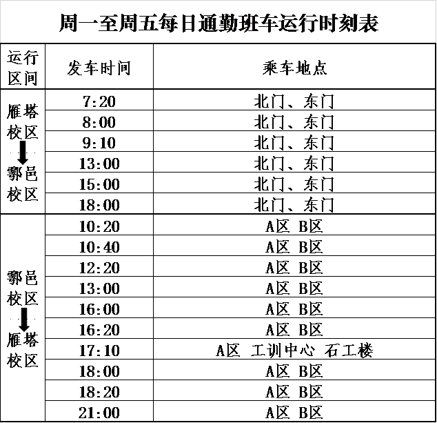 由于雁塔校区主干道石油路部分路段“海绵工程”施工已完成,自9月9日(周一)起,恢复该校区北门口、东门口乘(下)车点,南门内图书馆前临时乘车点同时取消。各班次通勤班车运行时刻不变(详见附表)。