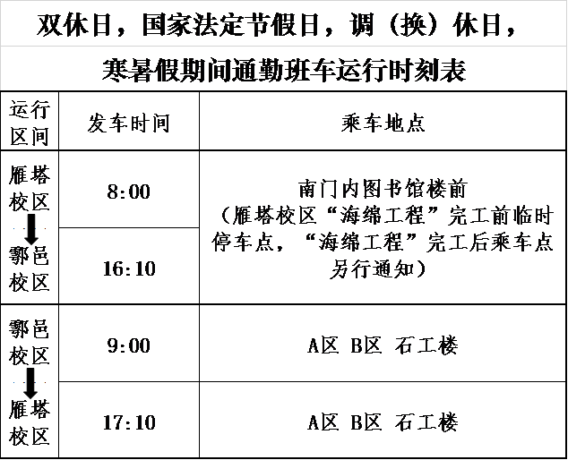 根据学校工作安排,本学期通勤班车运行时间如下: