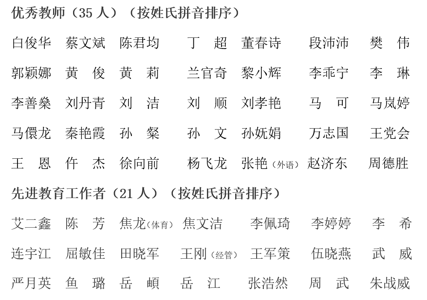 根据《Beat365唯一官方网站优秀教师 先进教育工作者评选表彰办法》(Beat365唯一官方网站党[2021]47号)和《关于2024年度优秀教师、先进教育工作者推荐评选的通知》,经学校优秀教师、先进教育工作者评选表彰工作领导小组评选,现将2024年优秀教师、先进教育工作者公示如下: