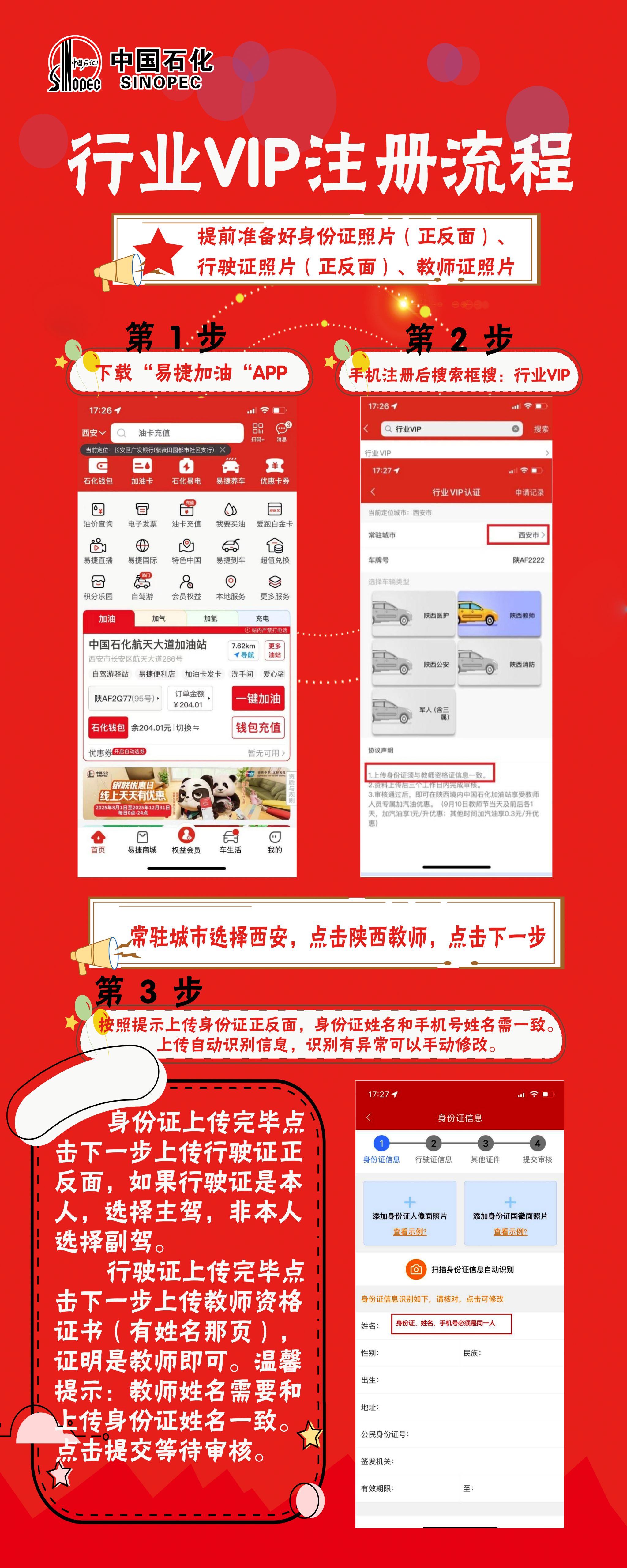 下载“易捷加油“APP→手机完成注册后搜索框搜:行业VIP→上传身份证(正反面)、行驶证(正反面)、教师证或工作证(带名字及单位章页),进行专项认证→提交审核→通过后自动加入对应标签并享受优惠政策。具体操作详见下图: