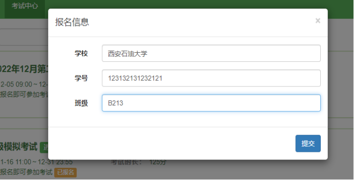 2、登录成功后点击“考试中心”,点击对应的场次,如英语一(或英语二)“去报名”,填写好自己的个人信息,点击确定后即可报名成功,要保证个人信息无误,避免影响成绩。(班级可忽略)