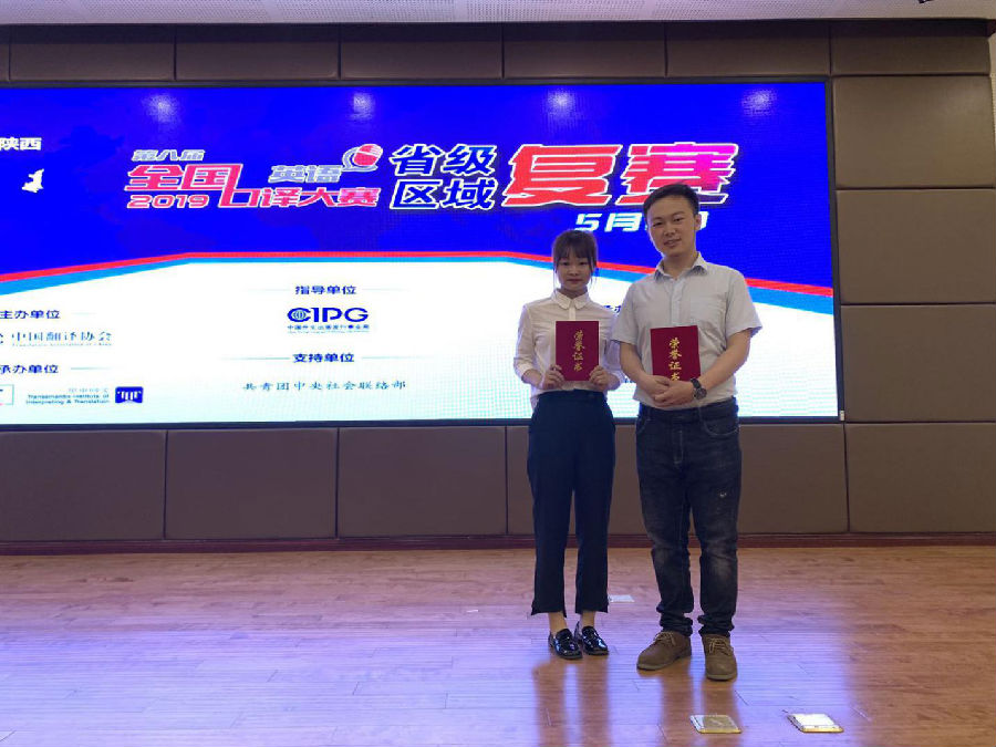 5月11日,2019年第八届全国口译大赛(英语)陕西赛区复赛在西安科技大学临潼校区举行。本次陕西赛区复赛由西安科技大学和华译教育咨询有限公司联合组织实施,来自全省高校的百余名选手参加了比赛。Beat365外国语学院派出4名学生参加本次比赛,其中,2017级翻译硕士研究生刘耀以排名第七的好成绩获得二等奖,成功晋级大区赛。2018级翻译硕士研究生易可获得三等奖。