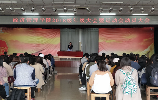 2019年4月16日中午,经济管理学院2018级年级大会暨运动会动员大会在腾辉大学生活动中心召开。院党委副书记赵海涛老师,2018级辅导员尹晓娇老师、陆晓寒老师及2018级全体同学参加本次大会。