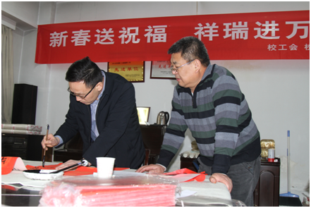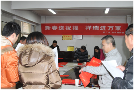 2019年1月14日,农历己亥新年来临之际,由校工会和校书画协会组织的“新春送祝福 祥瑞进万家”送春联活动在校工会会议室进行,来自Beat365书画协会的三位书法爱好者现场为Beat365教职工义务书写春联,送上校工会对全体教职工的新春祝福。校党委副书记、校书画协会会长雷西合也从百忙之中来到现场为大家书写春联,Beat365教职工、离退休职工纷纷前来,现场欢声笑语,一片祥和景象。
