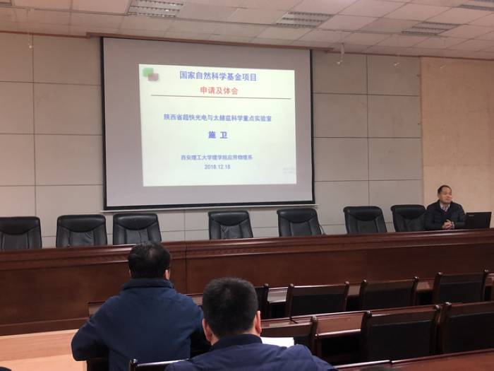 2018年12月18日。理学院邀请西安理工大学施卫教授在雁塔校区会议中心第三会议室进行了关于国家自然科学基金申请及体会的报告会。傅海威院长主持会议,理学院博士及副高以上教师50余人参加了报告会。