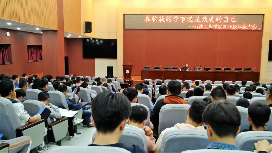 9月25日晚7点,石油工程学院2015级在新校区弘石报告厅召开了以“在收获的季节遇见最美的自己”为主题的年级大会。参加本次会议的有石油工程学院学生管理办公室主任孙会珠老师,2015级辅导员朱战威老师以及2015级全体同学。