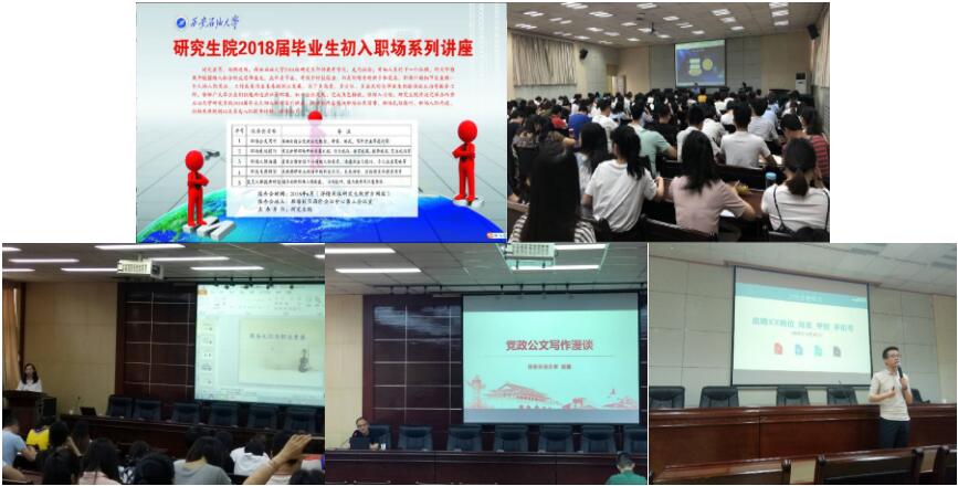 为了更好的帮助2018届毕业生走好职业生涯第一步,研究生院于2018年6月举办了第三届毕业生“初入职场”系列讲座,聘请校内外五位专家分别从职业生涯规划、职场沟通技能与策略、商务礼仪与职业素养、转变角色适应职场和党政公文写作漫谈等角度详细讲解初入职场需要具备的基本技能和注意事项。广大毕业生反响热烈、效果良好。