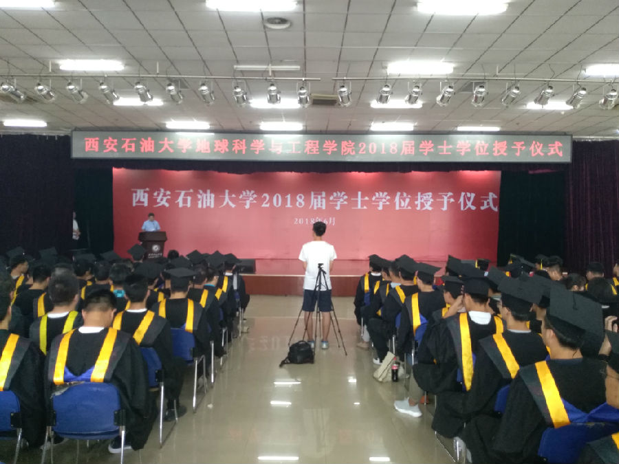 6月26日下午16:00,地球科学与工程学院在鄠邑校区腾辉大学生活动中心举行2018届毕业生学士学位授予仪式,学院党委书记马行天、院长王凤琴、副院长李辉峰、宋立军以及导师代表李艳霞、赵军龙、肖晖、李磊出席了仪式。仪式由副书记李庆本主持,300余名毕业生参加了学位授予仪式。