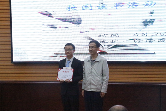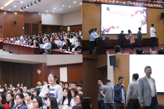 活动中,十名选手依次介绍了自己最喜欢的一本书,分享了自己的读书感受,鼓励大家多读书、读好书、好读书,在阅读中充实个人的精神世界。经济系吴文洁教授、石冬莲教授、姚小剑老师、董春诗老师、刘毅老师担任了本次活动的评委。比赛中选手们姿态自信、措辞慷慨、描述生动,博得了台下观众的阵阵掌声。樊昕昕同学分享《平凡的世界》心得,从她对这本书的感受中,我们可以感受到即使她是一个平凡的人但却有着一个不平凡的精神世界;黄海云同学带来的《咖啡飘香星巴克》,又将我们带入了另一个不同的精神世界,从她的言语中我们感受到了星巴克那浓浓的文化生活;罗一雯同学带来的《习惯的力量》使得大家懂得了一个好习惯的重要性;于啸林同学的《明朝那些事》将我们的思绪带到了那个繁荣昌盛的明朝。董春诗老师和刘毅老师在活动过程中进行了精彩的点评。经过评委评选,于啸林同学获得一等奖,张婷婷、高一涵、黄海云同学获得二等奖,樊昕昕、路倩倩、李龙霞、吴昱、郭敏、罗一雯等同学获得三等奖。与会领导和老师分别为获奖学生颁奖。