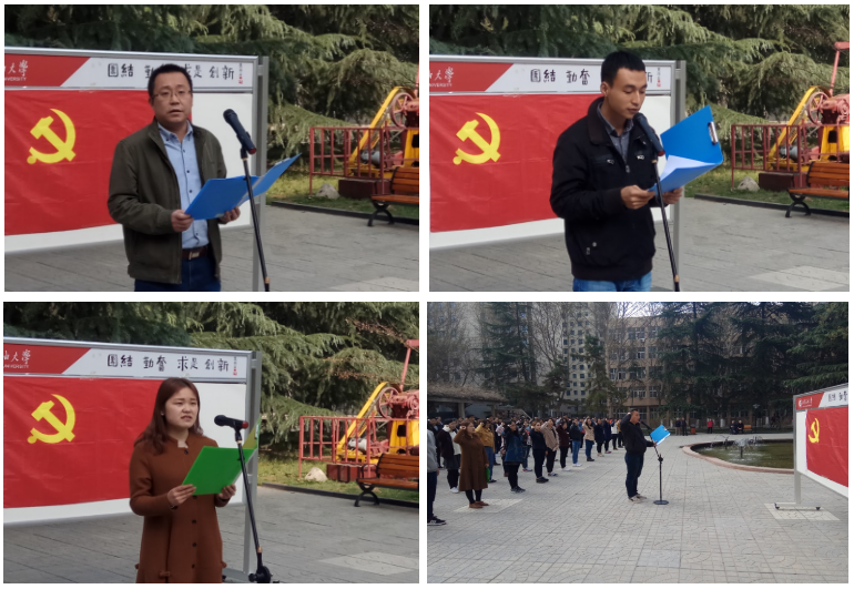 在雄壮的《国际歌》声,石工类2016级第一党支部何接宣布宣誓仪式正式开始。110名新党员面向党旗,举起右手,在领誓人研究生院机械类2016级第一党支部赵华东的逐句领读下,用慷慨激昂的语气,庄严向党旗宣誓,表达对党的忠诚、为共产主义事业奋斗终身的决心。其他参会人员与新党员一同宣誓,重温入党誓词。新党员代表研究生院石工类2015级第一党支部刘梦文同学作了表态发言,结合研究生日常学习工作生活,谈了一名共产党员的担当和责任,表明了自己投身党的事业的决心和勇气。