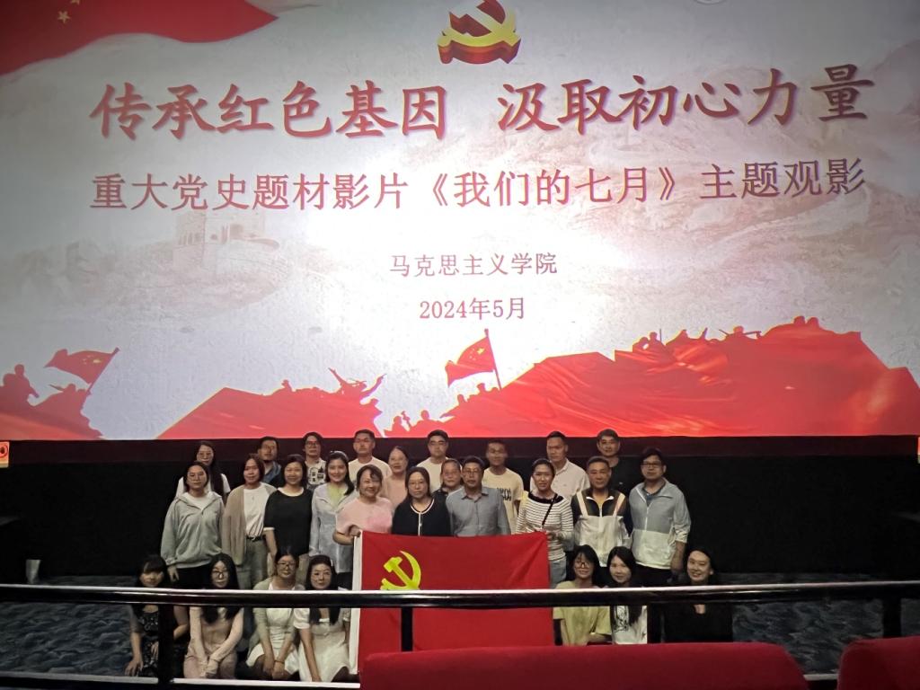 为深入学习贯彻习近平新时代中国特色社会主义思想和党的二十大精神,认真落实习近平总书记关于“用党的历史教育党员、教育干部、教育群众尤其是教育青少年”重要指示精神,5月11日下午,马克思主义学院党总支组织“传承红色基因 汲取初心力量”党史题材纪录片《我们的七月》主题观影活动。学院党总支委员、党支部书记、师生党员等二十余人参加活动。