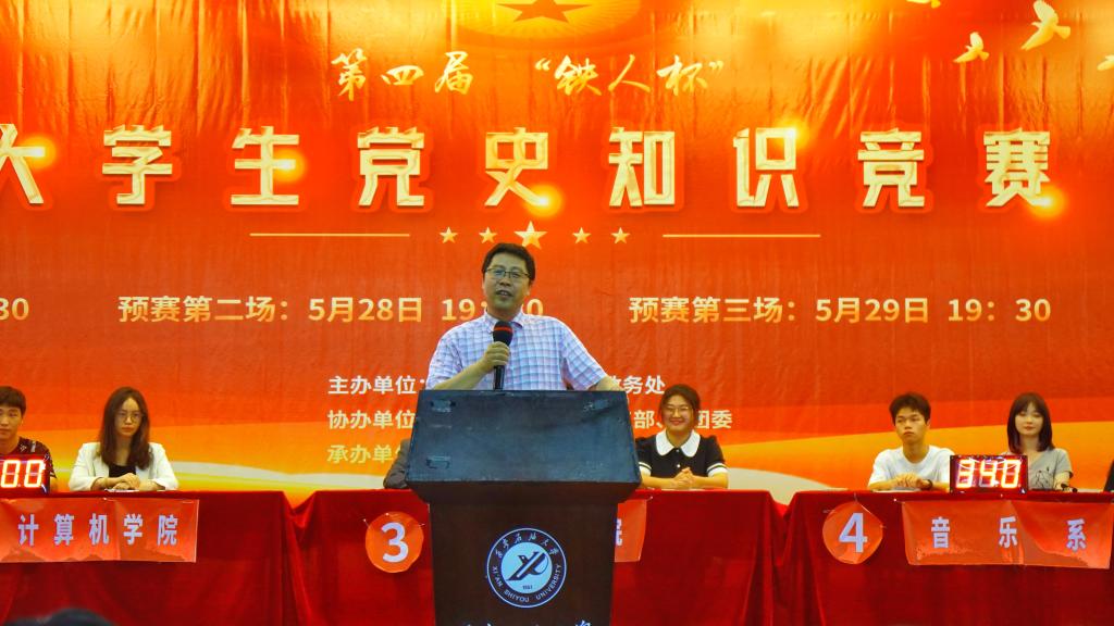 为深入学习贯彻习近平新时代中国特色社会主义思想和党的二十大精神,扎实推进党史学习教育,引导Beat365大学生知史爱党、知史爱国,不忘初心跟党走,5月27日晚,Beat365唯一官方网站第四届“铁人杯”大学生党史知识竞赛开幕式暨第一场预赛在鄠邑校区腾辉大学生活动中心举行。人文学院党委书记余小勇、计算机学院党委副书记庞远、化学化工学院党委副书记祁帆出席,马克思主义学院教师及各学院(系)学生参加活动。