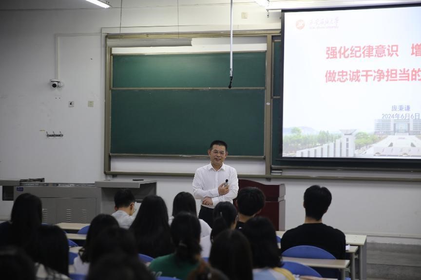 为扎实推动党纪学习教育走深走实,根据学校党委关于在全校开展党纪学习教育的要求和学院党委工作安排,6月6日晚,计算机学院党委书记庞秉谦结合学习体悟和工作实际,在鄠邑校区博思楼B110教室讲授了题为“强化纪律意识,增强纪律定力,做忠诚干净担当的大学生党员”纪律党课。学院2021级本科生党员80余人参加了党课学习。