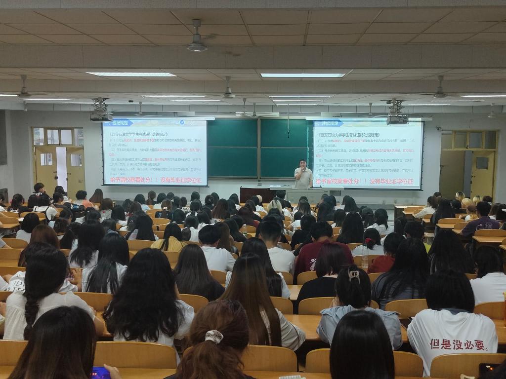 会议第一部分,人文学院2022级辅导员范嘉欣、2023级辅导员王凯杰详细介绍了学校的考试管理规定和违纪处理办法,通报了学校已处理的违规违纪案例,强调了诚信考试的重要性,提醒同学们要自觉遵守考试纪律、杜绝一切作弊行为,摒弃侥幸心理。同时就如何备考、以积极心态应对考试等方面提出实用建议,全体学生签订了考试诚信承诺书。两位辅导员还就近期的稳定安全事故、下学年计划提醒学生注意身心健康,保持良好状态面对未来,提前规划人生方向。