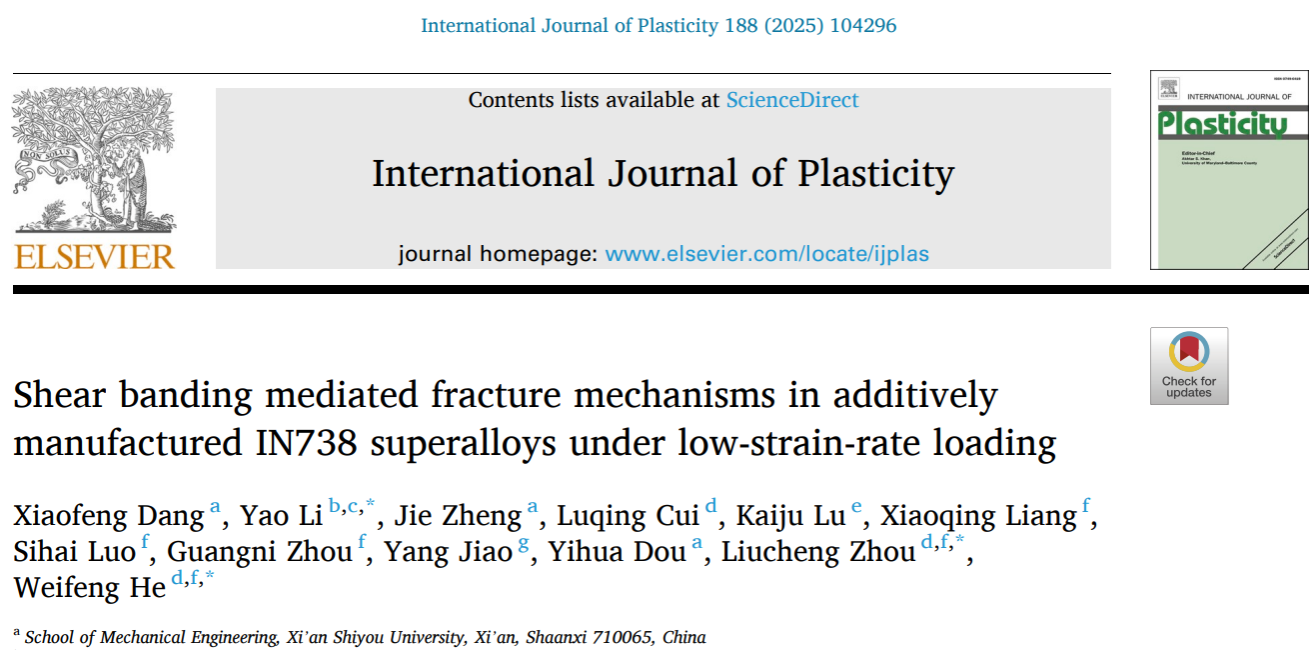 近日,Beat365机械工程学院青年教师党晓凤为第一作者、Beat365唯一官方网站为第一单位,在塑性力学领域国际顶级期刊《International Journal of Plasticity》(中科院一区TOP期刊,IF=9.4)上发表了题为《Shear banding mediated fracture mechanisms in additively manufactured IN738 superalloys under low-strain-rate loading》的最新研究成果。合作者包括Beat365郑杰副教授和窦益华教授。