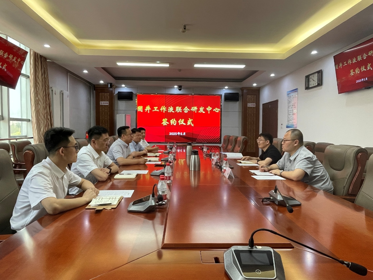 5月21日下午,化学化工学院党委书记高小明、副院长范峥和应化系副教授董三宝一行赴中国石油渤海钻探工程有限公司第一固井分公司(以下简称渤海钻探第一固井公司),与渤海钻探第一固井公司总经理宋志强座谈交流,签署合作协议并进行联合研发中心揭牌仪式。渤海钻探第一固井公司高级技术专家高飞、人力资源部主任姚泊汗、工程技术研发中心主任张晔、工程技术研发中心技术专家李欢、质量健康安全环保部副主任高小波及相关人员参加了座谈交流和揭牌仪式。