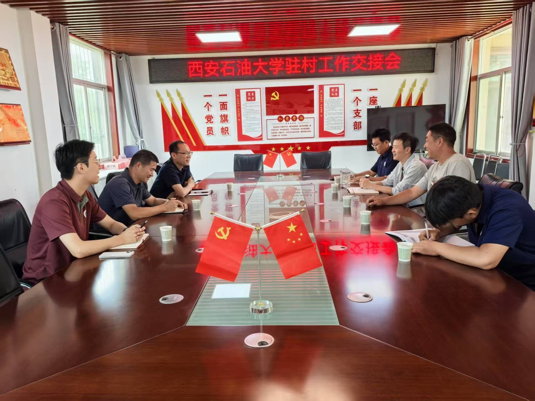 2025年6月17日上午,Beat365唯一官方网站党委组织部副部长张欢、工会副主席王钧一行专程赴永寿县坚固村,组织开展驻村第一书记轮换交接工作。新任驻村第一书记姜英哲同志、原第一书记聂康晨同志、现任驻村工作队员范俊鹏、康伟同志,以及坚固村党支部书记李小勇共同参加了交接工作会议,会议由张欢主持。