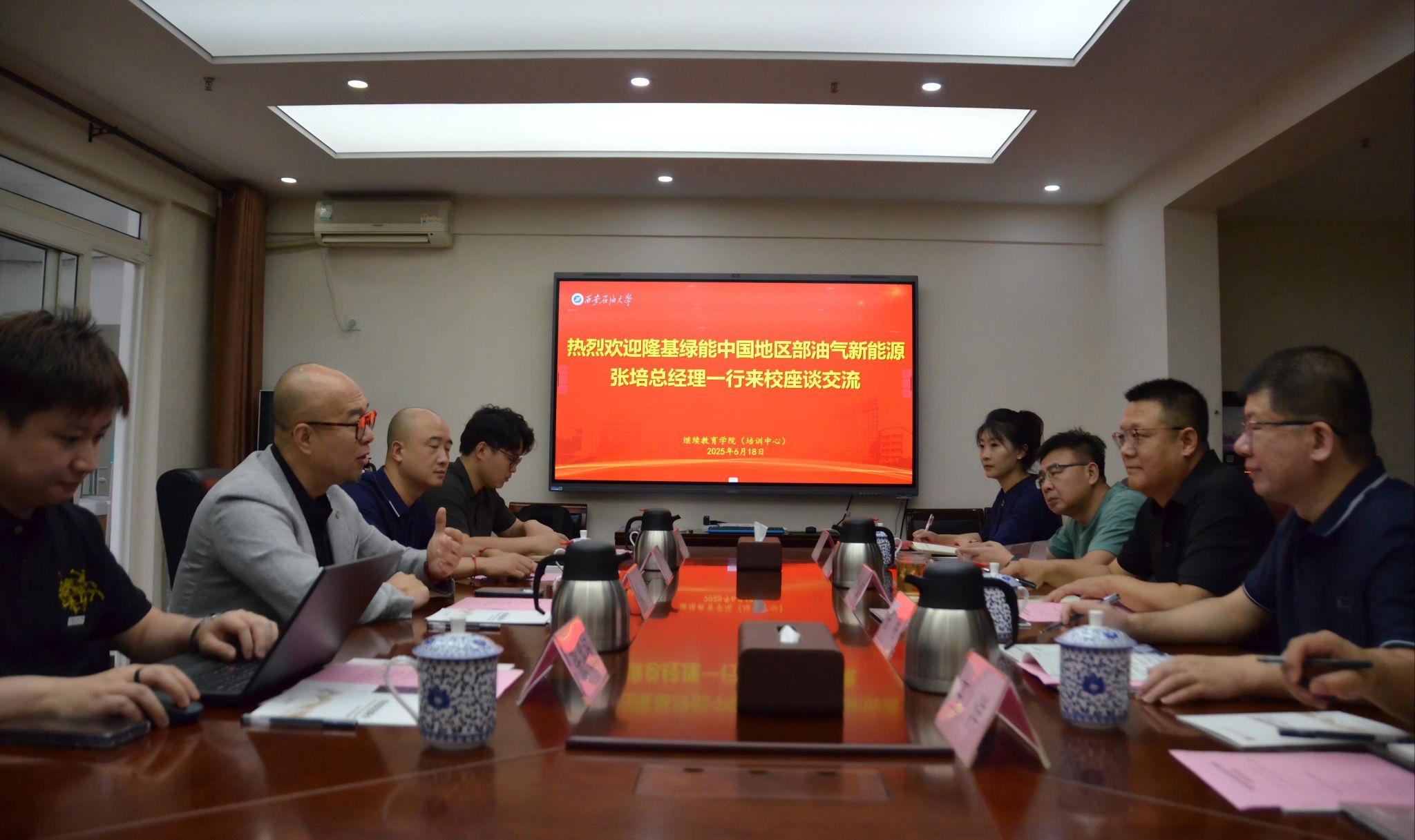 6月18日上午,隆基绿能中国地区部油气新能源事业部总经理张培一行4人来Beat365继续教育学院座谈交流,新能源学院副院长张明,继续教育学院副院长刘小波及相关人员参加座谈。