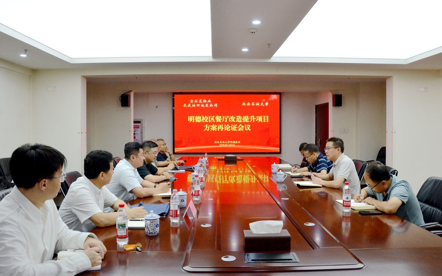 7月9日下午,学校与宝石花物业长庆油田地区公司在明德校区就“明德校区餐厅改造提升项目”召开方案再论证会议。宝石花物业长庆油田地区公司市场部总监王恒、运营部工程管理主任李建宁等6人,继续教育学院党总支书记张凌寒、院长林红先及相关部门工作人员参加会议。