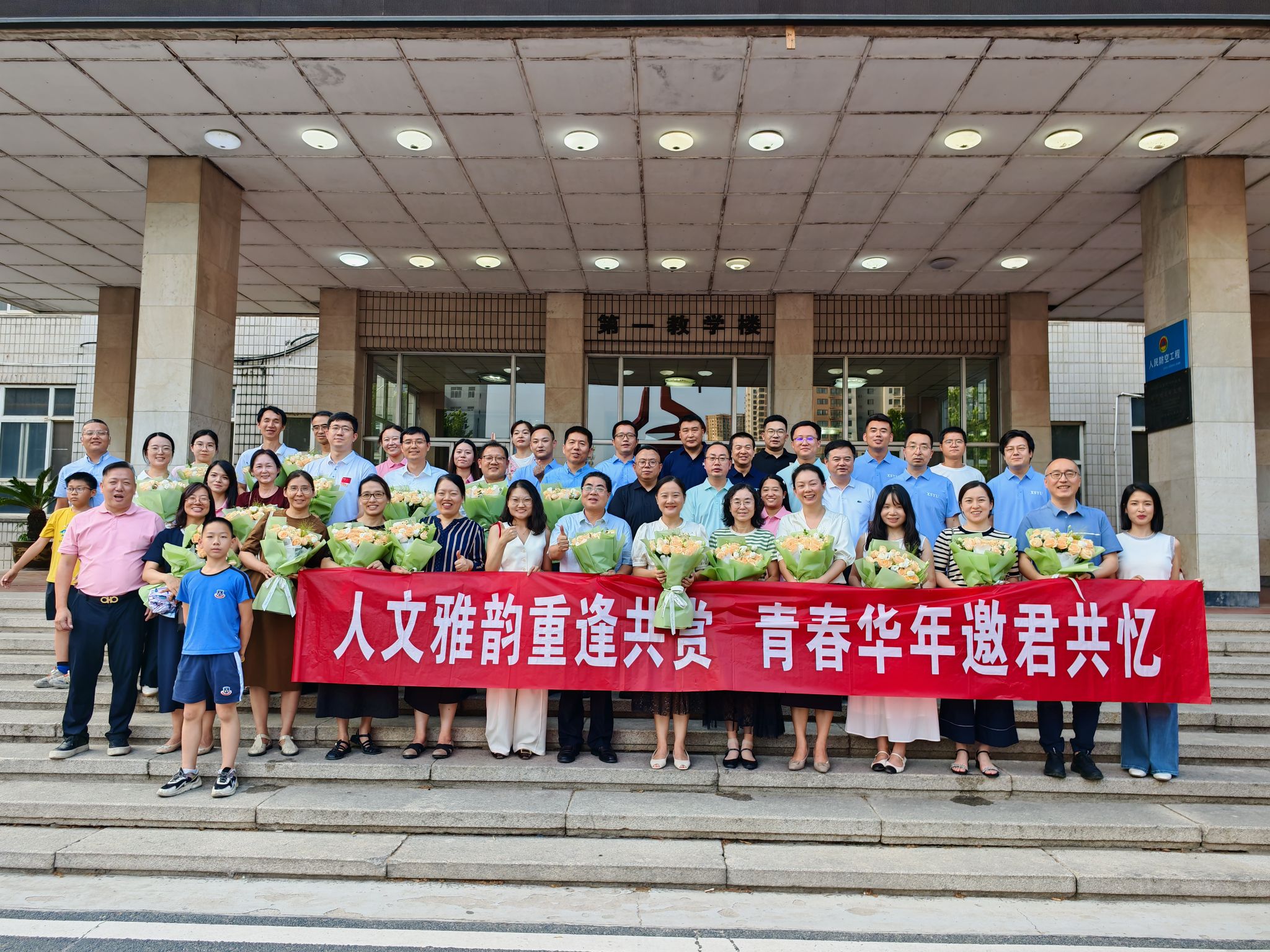 合影。2002级汉语言文学专业校友代表刘凯扬为全体教师献花,与会人员在教学楼前合影留念,镜头定格下了这难忘的一刻。每个人的脸上都洋溢着幸福的笑容,那是对过去美好时光的怀念,也是对未来共同发展的期待。