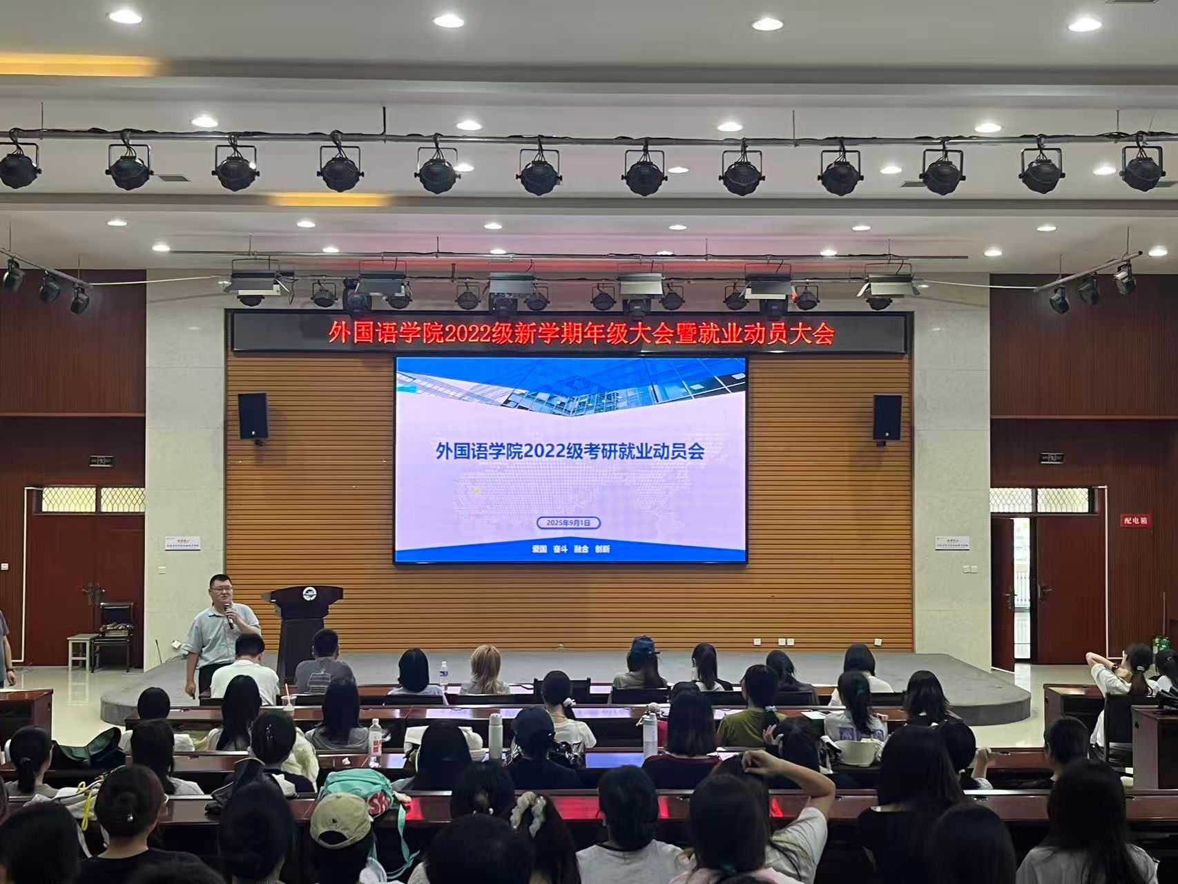 为贯彻落实学校工作要求,引导毕业生树立正确就业观念,提高就业积极性和主动性,助力毕业生顺利求职升学,9月1日,外国语学院在崇文楼108室召开2026届毕业生就业动员大会。外国语学院党委副书记、毕业班辅导员、学院毕业生近200人参加会议。会议由院团委书记陈浩主持。