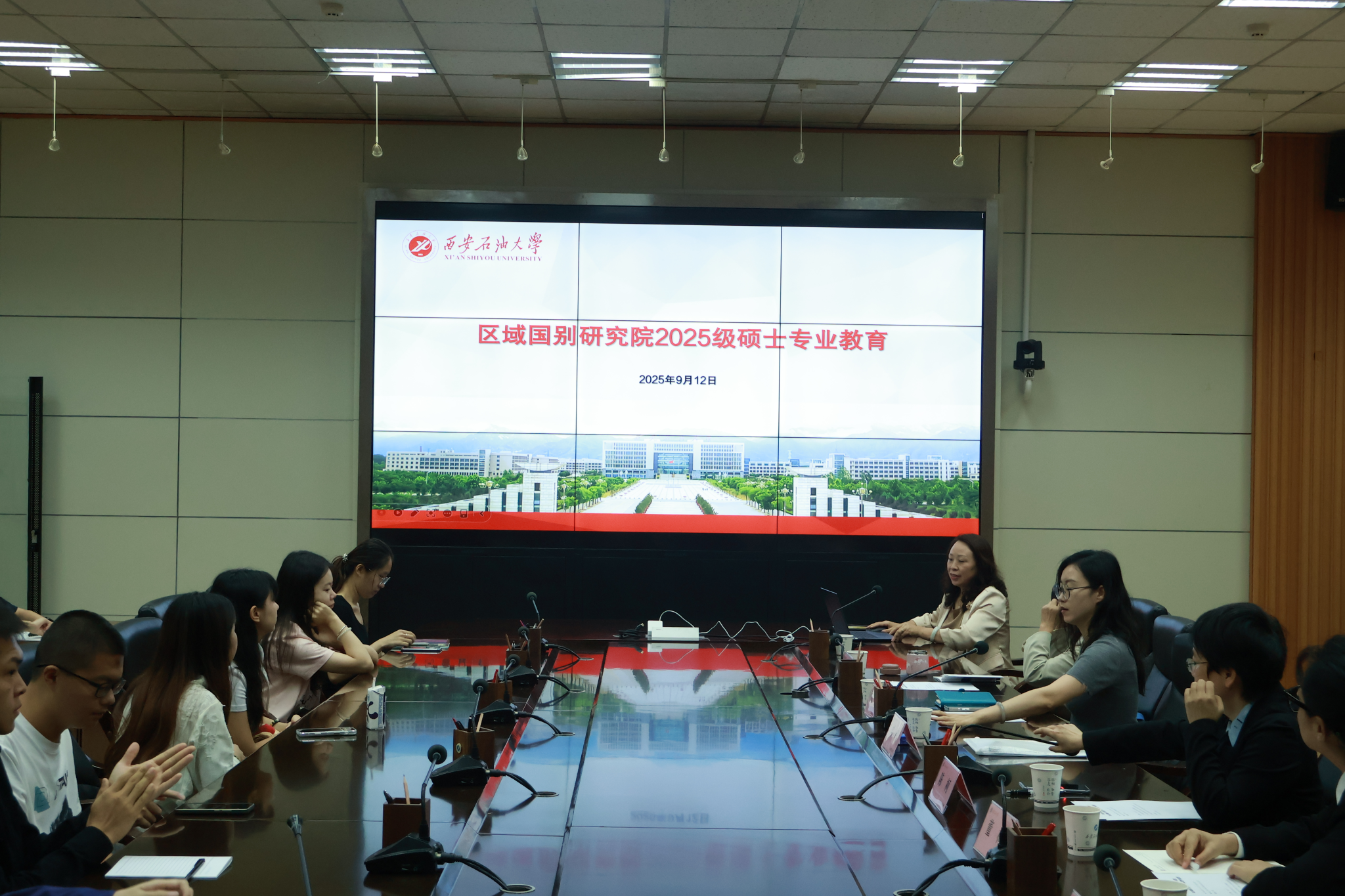 9月12日上午,区域国别研究院在雁塔校区会议中心第二会议室举办2025级区域国别学硕士研究生开学典礼暨入学专业教育。研究院执行院长刘辉、区域国别学硕士研究生导师以及2025级研究生新生参加会议。会议由研究院陶李主持。