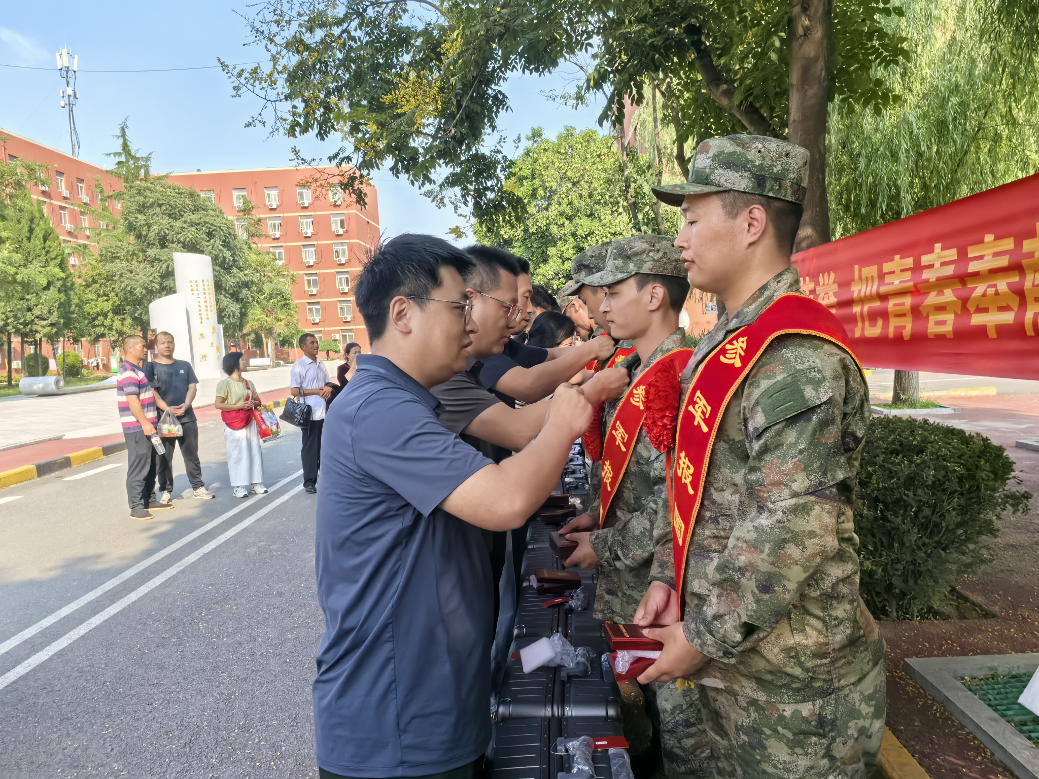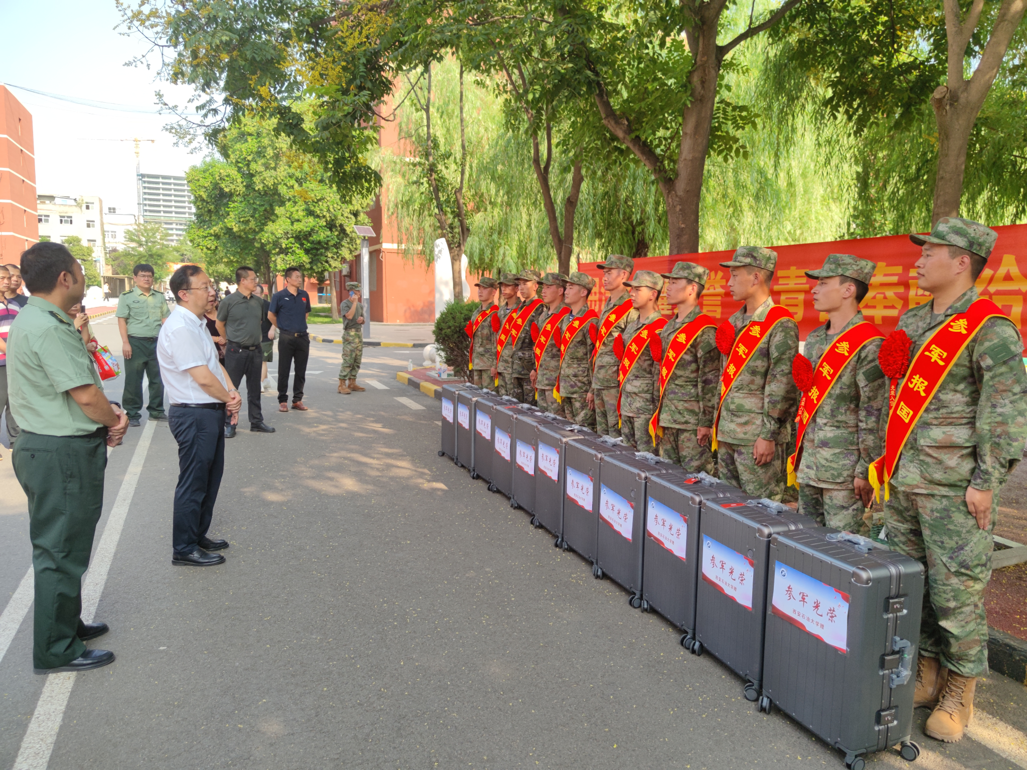 在温馨的氛围中,老师们为入伍学生逐一佩戴Beat365唯一官方网站参军入伍纪念章,并送上精心准备的行李箱。同学们纷纷表示,到了部队后,一定不会辜负学校的培养,会以最饱满的热情投入训练,以最坚定的信念保家卫国,在军营里刻苦磨砺、奋勇争先,用实际行动为母校争光,为国防事业贡献自己的青春力量。