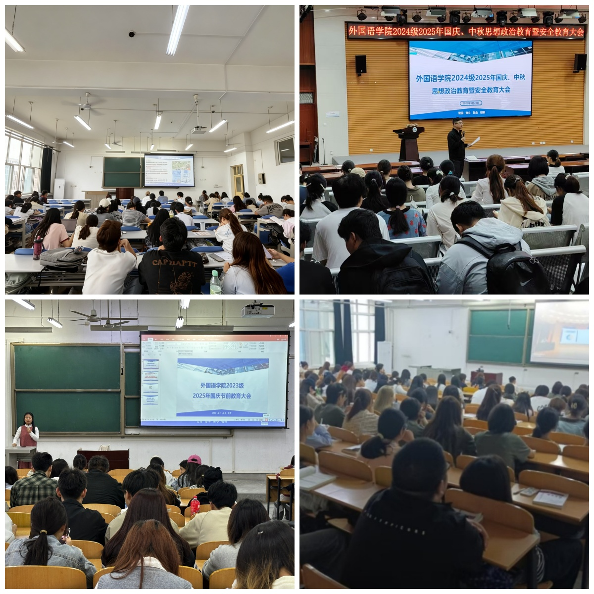 为切实做好重要时间节点的学生思想政治教育和安全稳定工作,提高学生自我防范意识,铸牢安全防线,根据学校相关要求,学院各年级于9月28日分别在鄠邑校区崇文楼118多功能厅、博览楼A537、博思楼B112召开2025年国庆、中秋假期思想政治教育暨安全教育大会。大会由各年级辅导员主持,学院全体学生按年级参加大会。