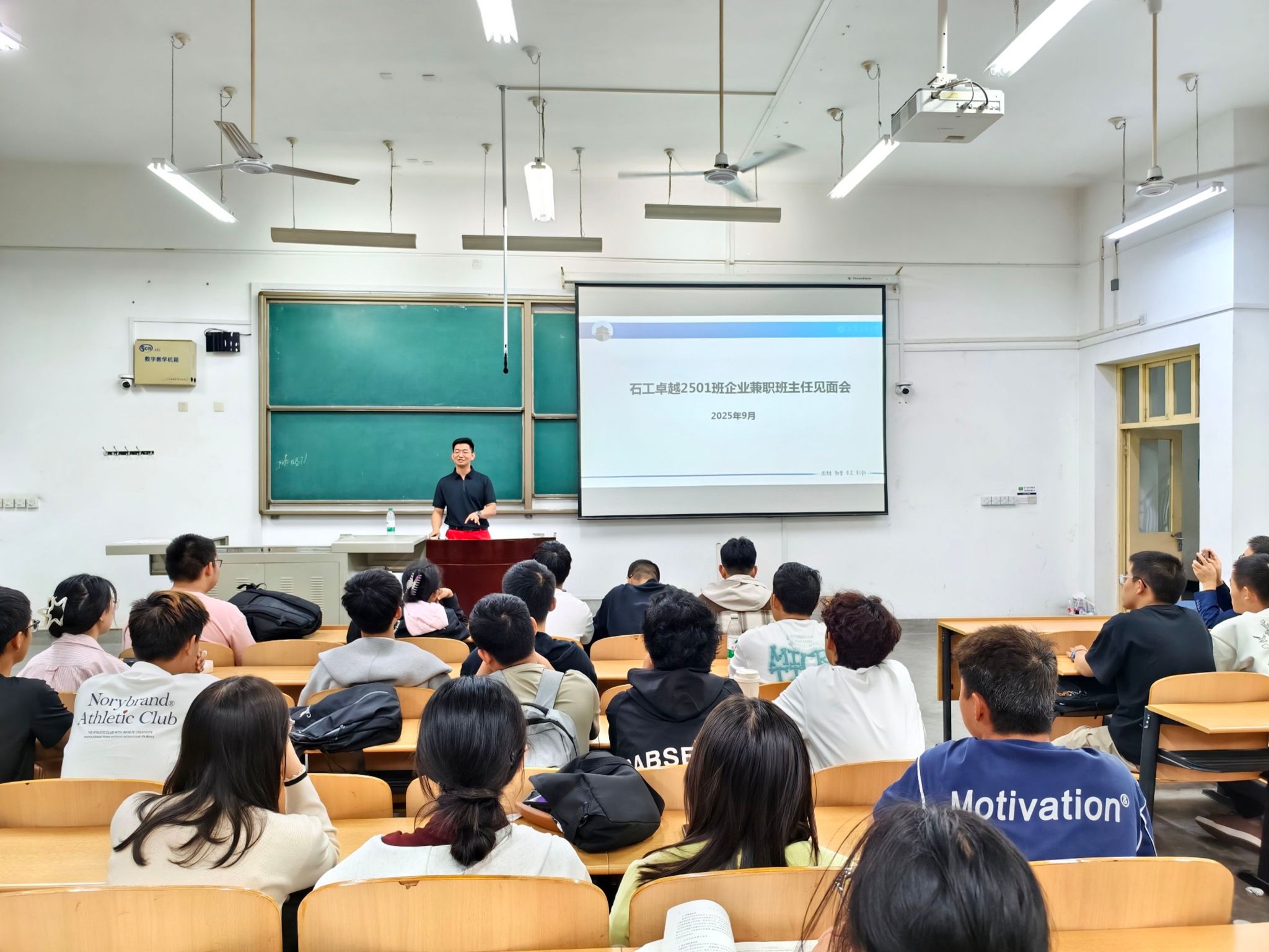 在博思楼208教室,陈建国组织召开了石工(卓越)2501班首次线下班会,他勉励同学们要传承发扬石油精神、铁人精神,树立“为祖国献石油”的远大理想,在服务行业发展中实现人生价值。