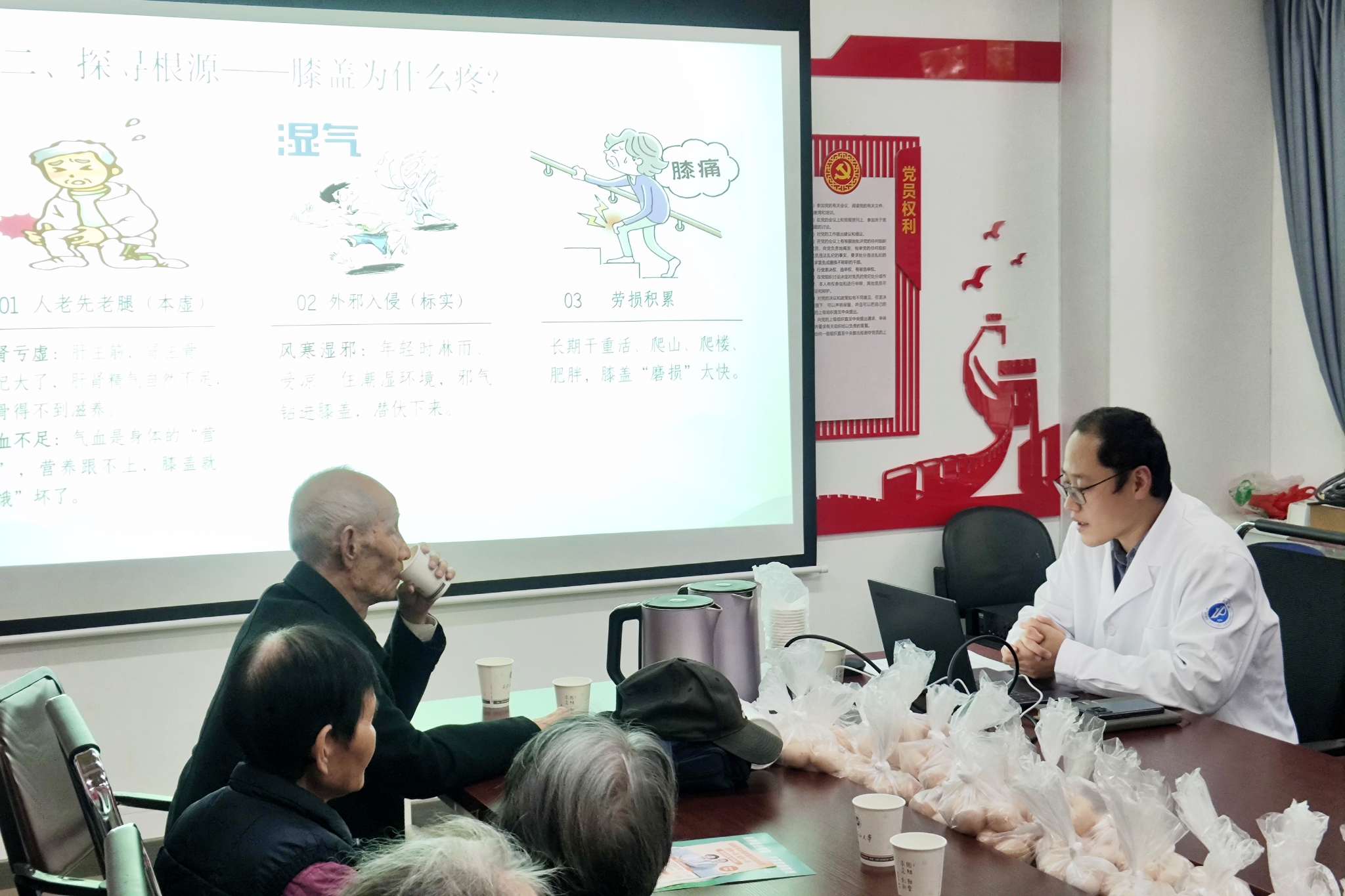 整场讲座兼具现代医学的严谨指导与传统中医的养生智慧,内容干货满满、实用性极强,赢得在场听众的一致认可。活动现场氛围热烈,老同志们专注聆听、不时点头,遇到重点内容还拿出手机拍照记录,互动环节更是积极提问,与医生深入交流健康困惑。讲座结束后,校医院还贴心准备了定制小礼品,让温暖关怀直抵人心,进一步提升了老同志们的参与感与幸福感。随后,Beat365唯一官方网站社区卫生服务站负责人詹华斌向大家介绍了站点的公共服务项目,重点提及近期新增的理疗项目与检验检查服务,并特别说明可为行动不便的老人提供“定制化上门医疗服务”,贴心举措获老同志们纷纷点赞。