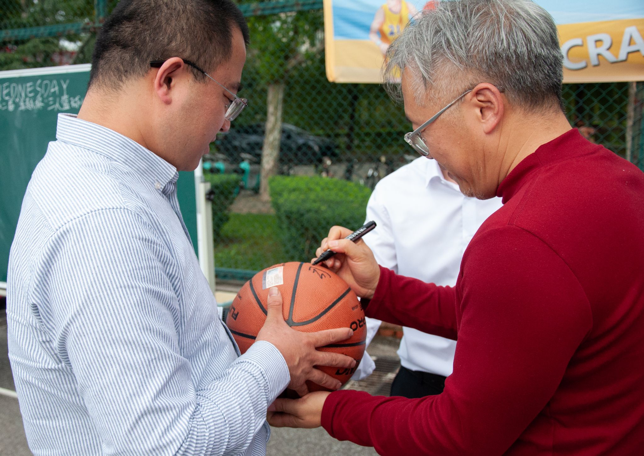 司马文龙与黄海共同为纪念篮球签名。