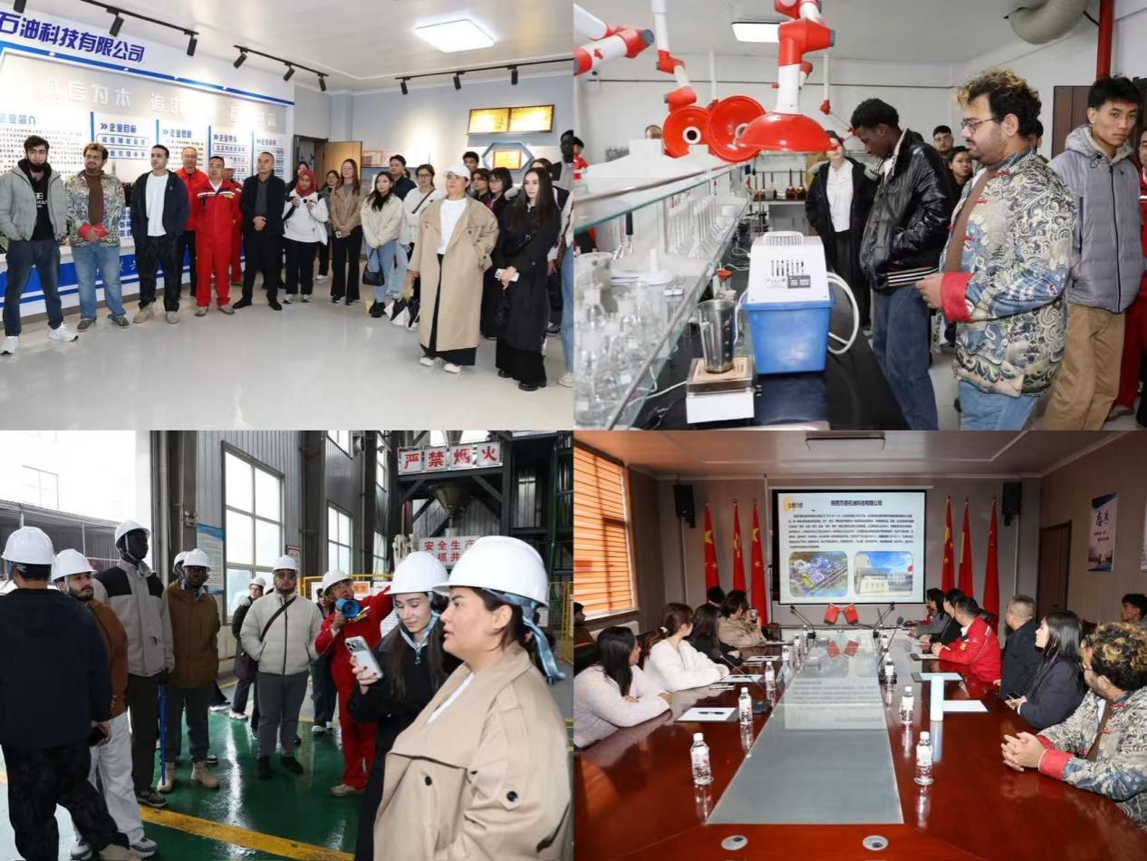 活动首站聚焦中国能源领域发展,师生一行到访陕西万德石油科技有限公司。公司副总经理李耀龙对师生表示欢迎,结合企业发展历程、主营业务,系统介绍石油行业最新形势与未来战略规划,帮助国际学生建立对中国能源企业创新成果的整体认知。在工作人员带领下,国际学生依次走进泥浆实验室、理化实验室、固井实验室、自控中心及高分子集合物、纤维素生产车间,直观了解各类设备功能、实验原理与生产流程,清晰掌握现代技术在石油科技领域的实际应用。互动交流环节中,国际学生结合自身专业知识,围绕参观中的疑问积极提问;企业工作人员逐一细致解答,并就国际学生未来在华、在企就业发展展开深入探讨,为学生职业规划提供参考。
