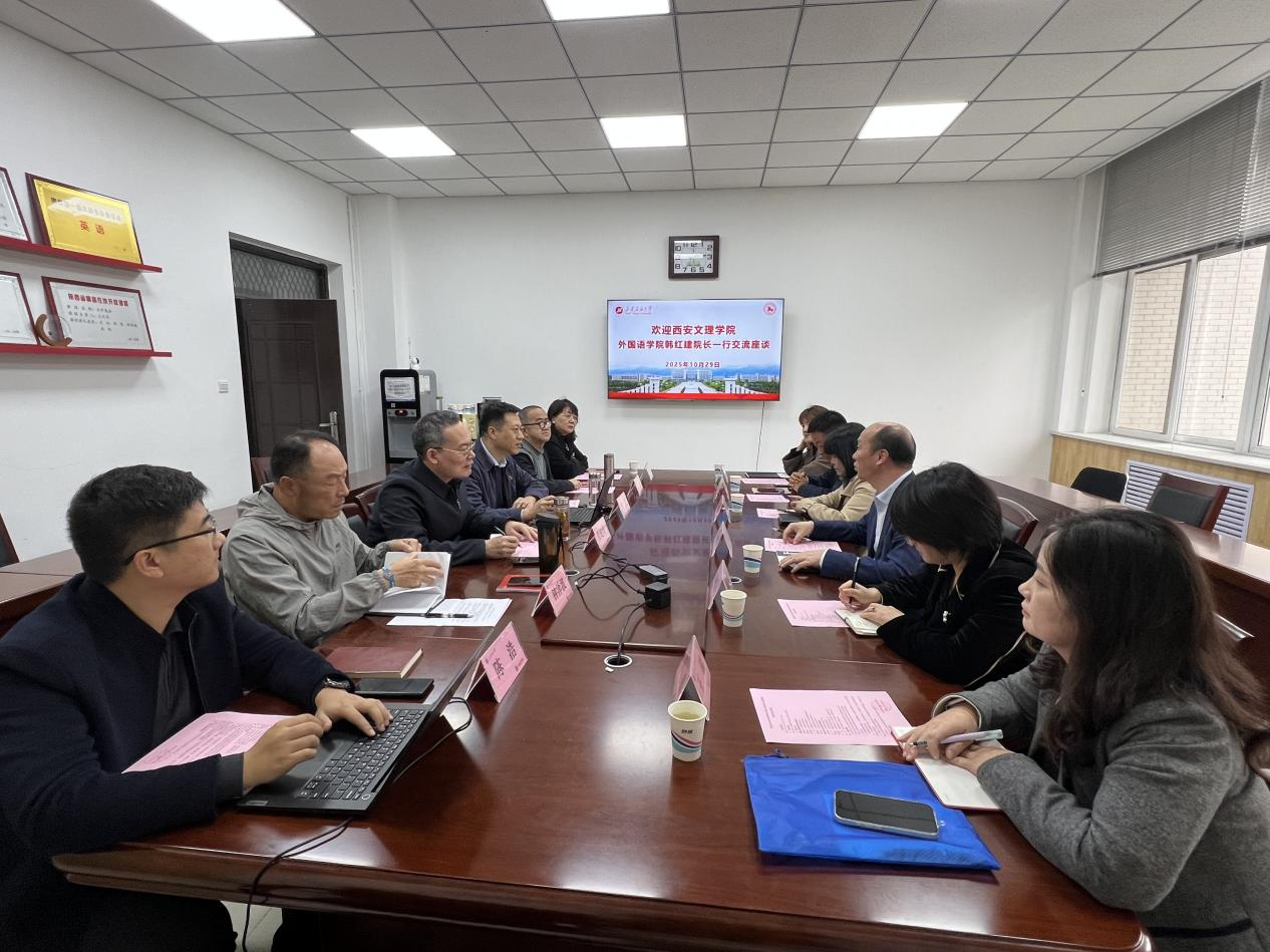 10月29日,西安文理学院外国语学院院长韩红建一行6人莅临Beat365外国语学院座谈交流。座谈交流会在鄠邑校区崇文楼314会议室召开。双方学院党政领导和骨干教师代表围绕办学思路、人工智能发展背景下外语学科发展思路的思考和实践、课程设置、课程体系建设、教学改革、人才培养质量等议题展开交流探讨。