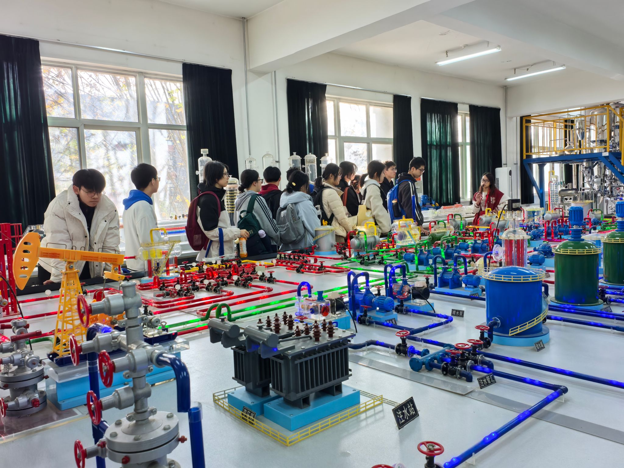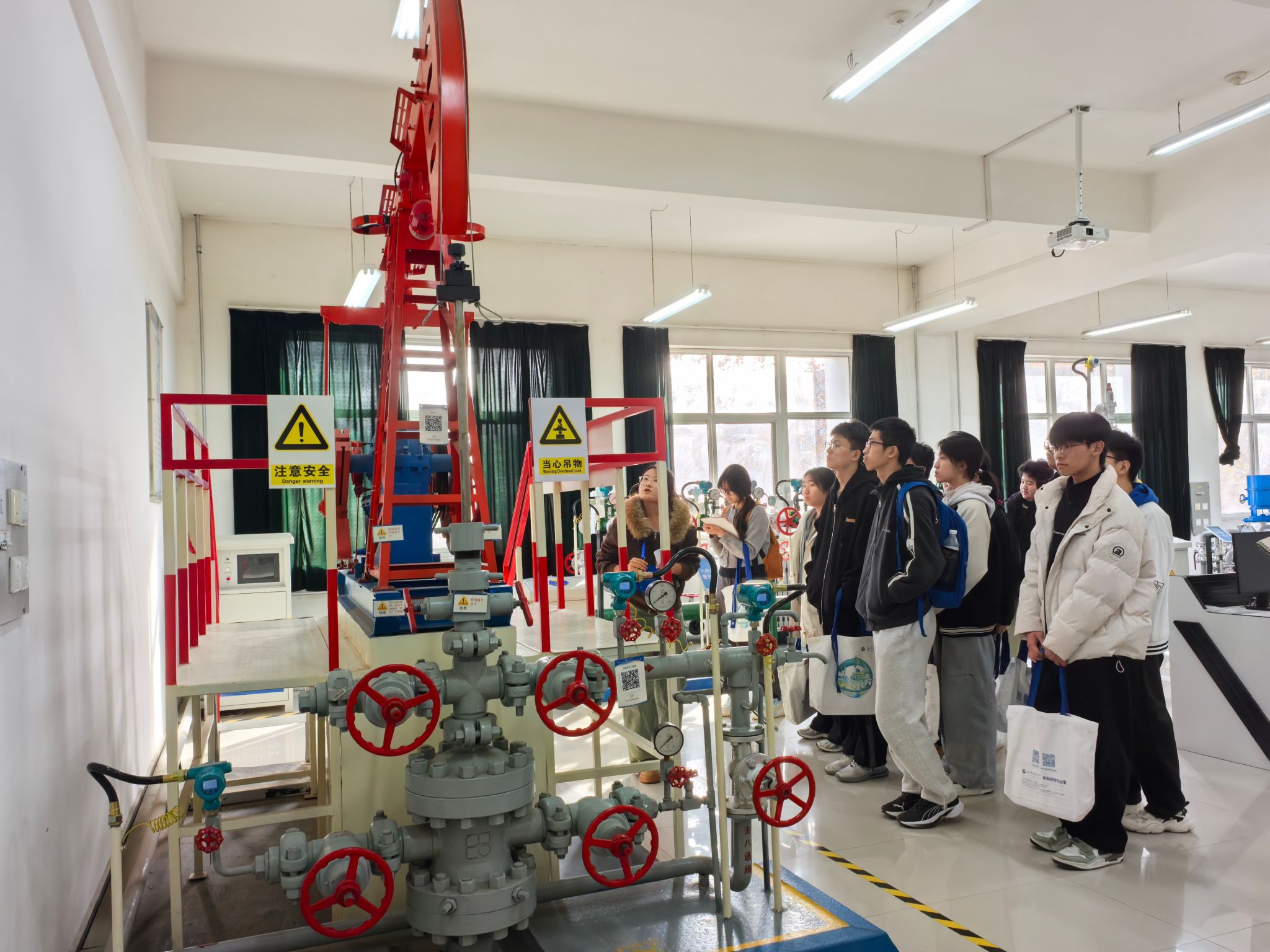 研学活动最后一站参观了Beat365陕西省石油石化虚拟仿真实验教学中心。在大学生讲解员的带领下,五高师生参观了钻井实训室、地质标本实训室、采油实训室、油气分布沙盘、集输、炼化实训室、采油实训室。通过参观学习,学生初步了解了石油勘探、开采、炼化和运输的全过程,近距离感受到了石油石化及地质行业的魅力与挑战。