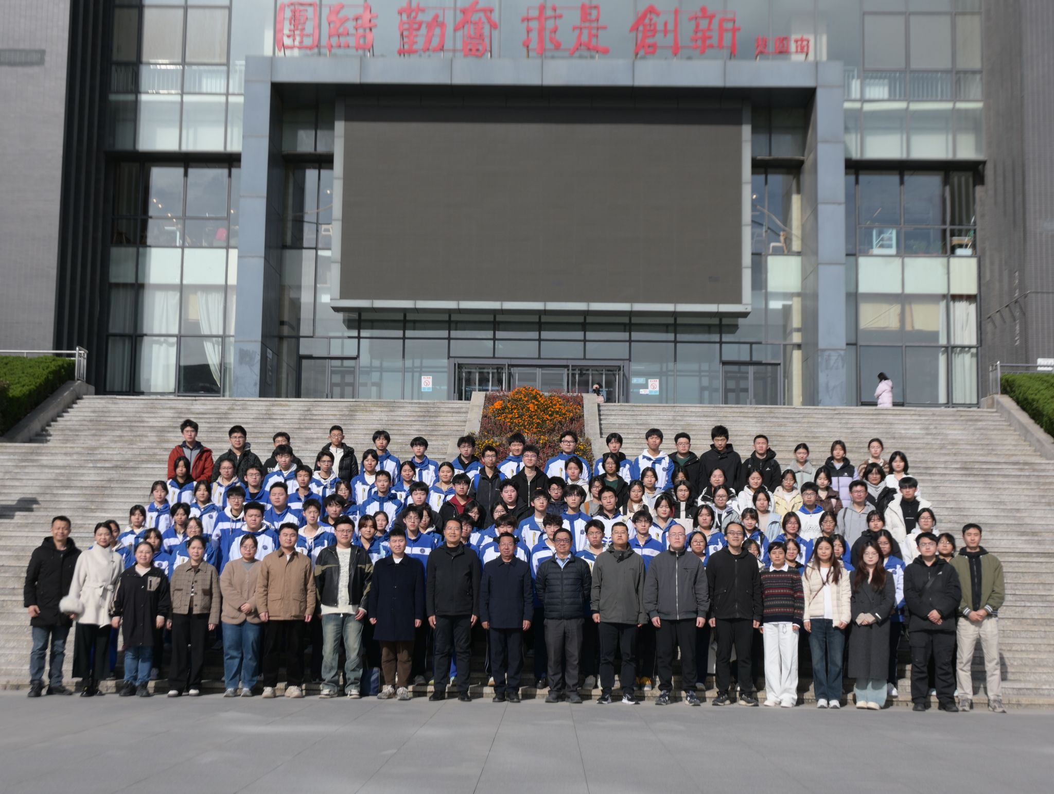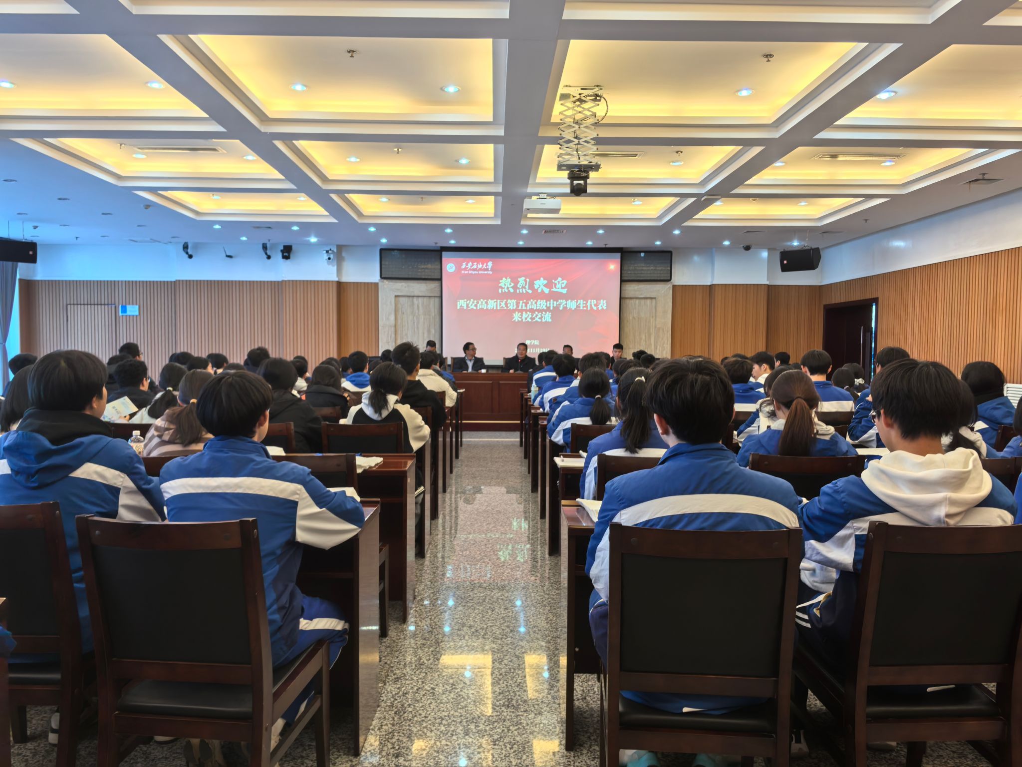 2025年11月19日下午,西安高新区第五高级中学(以下简称五高)受邀来Beat365开展研学活动,校长刘占权带领师生代表100余人参加活动。理学院招生宣传工作组代表学校接待五高师生并在鄠邑校区第一会议室举行简短的欢迎仪式。理学院党委书记席利哲、副院长马儇龙、理学院教授兼五高科技副校长郭文阁及理学院教师代表参加欢迎仪式。欢迎仪式开始前,与会人员在图书馆南门台阶前合影留念。欢迎仪式上,席利哲代表学校及理学院对五高师生代表的到来表示热烈欢迎,并简要介绍了研学活动行程和Beat365唯一官方网站。