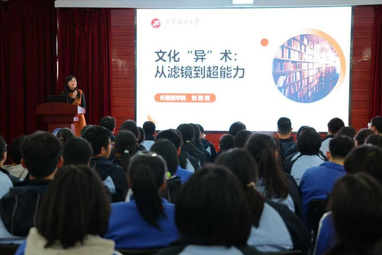 刘西娟老师为学生们作了题为《文化“异”术:从滤镜到超能力》的专题讲座。她从文化意识的培养出发,引导学生打破刻板印象,以多元视角理解世界,深入分析不同文化背景下的思维差异。