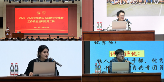 11月10日晚,培训第二讲由校院两级优秀学生干部代表在弘石学术报告厅作工作经验分享。研究生会执行主席张振陆以“同研会逐光,赴成长远方”为题,从研会总体概况、部门特色活动、个人成长三个方面向同学们分享工作技能;校学生会主席团成员虞茗荃以“学生干部核心素养和文体活动筹备”为题,展开活动筹备的技能传授,助力学生会新成员掌握协调沟通、活动策划等核心技能;石油工程学院学生会执行主席梁国玺以“工作开展与筹办”为题,从活动类型分析、活动流程总结、活动宣传推广三个方面分享经验,助力学生会成员提升工作能力。