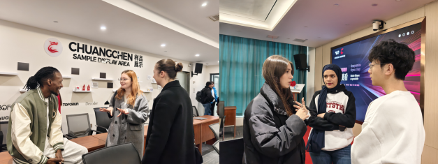 互动交流环节中,留学生们与企业一线员工展开近距离沟通,围绕岗位学历专业要求、进出口业务核心需求、主流直播平台应用等关键问题踊跃提问。刘总监与外籍人力资源负责人逐一细致解答疑问,并结合留学生的专业特长,提供了极具针对性的就业创业规划建议,现场交流氛围热烈融洽,有效回应了留学生们的困惑。