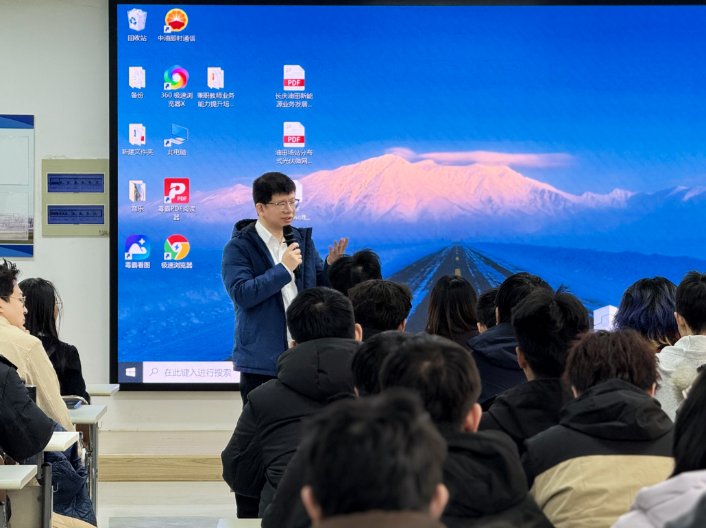 在座谈会上,校友蒋守强以长庆油田新能源业务发展及项目管理为题就油气与新能源融合技术的现场应用为同学们做了介绍。新能源学院副院长张明从围绕“什么是新能源”“国家为什么要发展新能源”“油田企业新能源应用发展趋势”等三个问题展开系统讲授,让同学们了解到相较传统能源新能源的发展优势、当前国际国内形势下国家发展新能源的必要性以及未来油田企业对新能源人才的需求等。随后研究生们围绕油气行业发展趋势、长庆油田对人才的招聘需求以及个人在油气行业的未来发展与蒋守强校友及张明副院长进行了互动交流,现场气氛热烈。