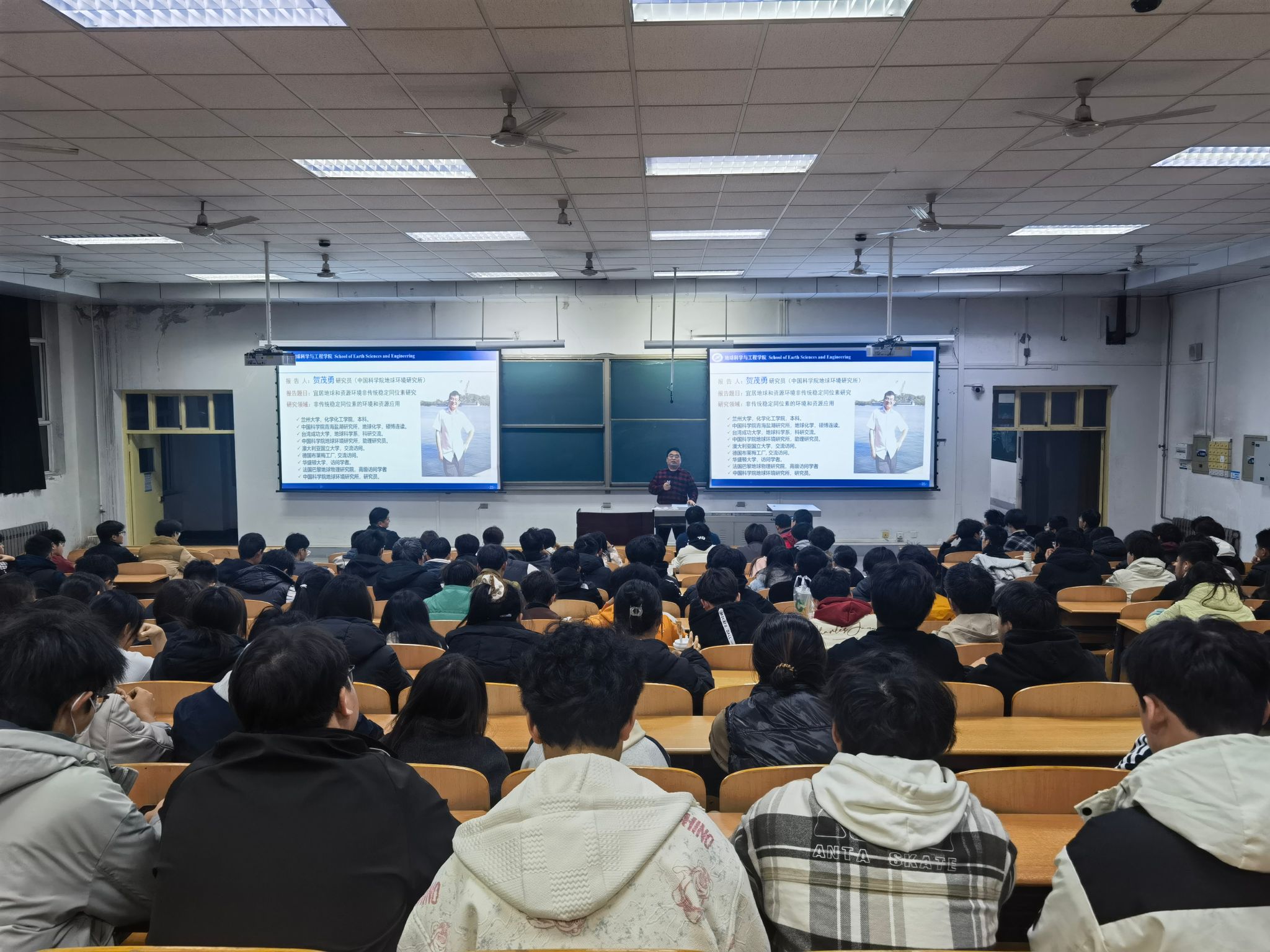 为积极回应学生关切,引领学生专业学习,11月27日晚,地球科学与工程学院邀请中国科学院青海盐湖研究所贺茂勇研究员为学院学生作学业引领专题讲座。学院院长宋立军主持讲座,学院党委副书记董丙剑、基础地质系副主任李海、学院学工办主任姜楠和学院2025级本科生参加。