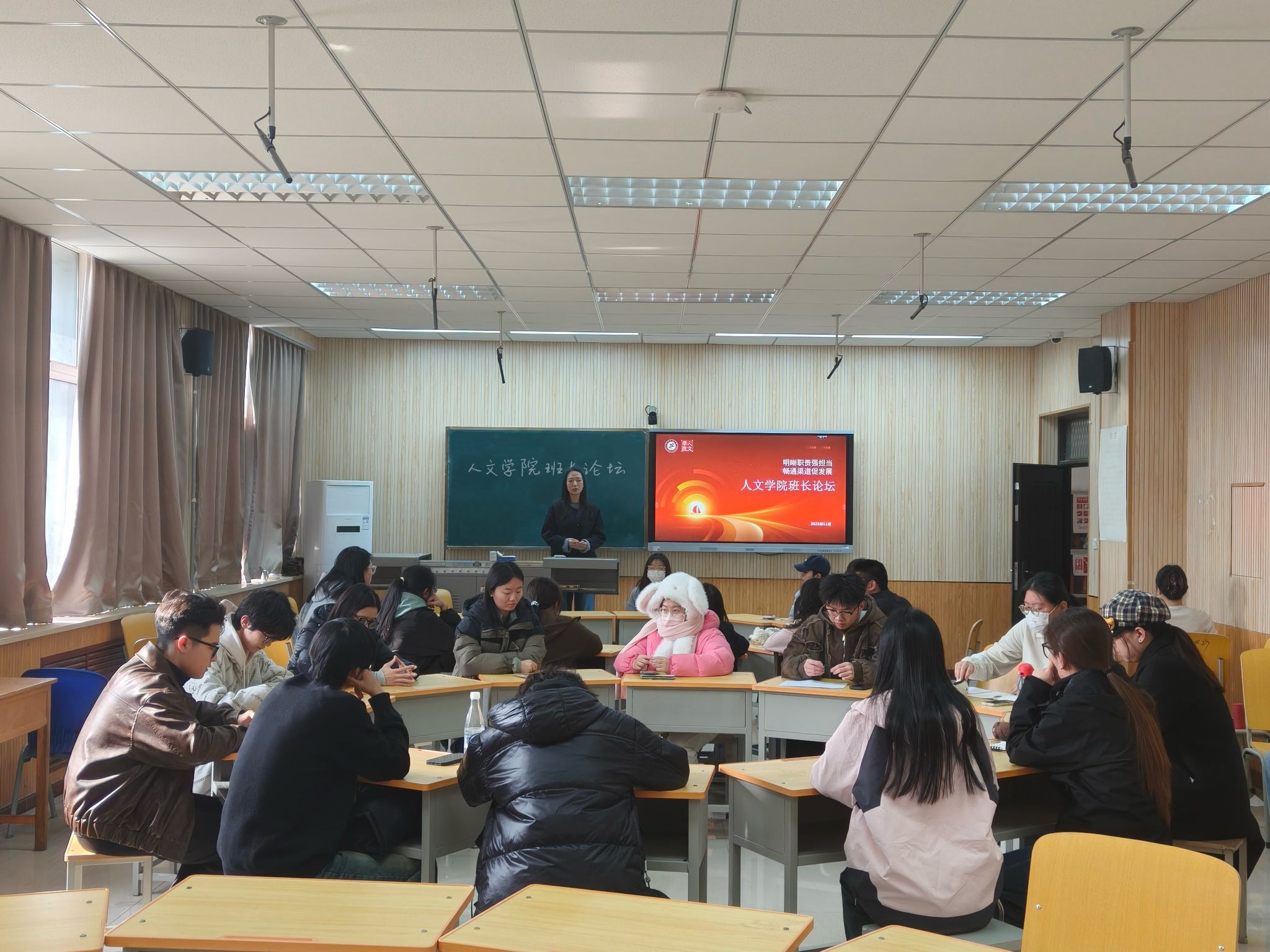 为进一步强化学生骨干责任意识,构建高效协同的师生沟通机制,锤炼具备“四实一新”特质的班级管理核心力量,人文学院于12月1日在崇文楼233教室顺利举办班长论坛。本次论坛以“明晰职责强担当 畅通渠道促发展”为主题,汇聚各年级班长、辅导员与班主任代表,通过经验共享、问题剖析与策略共创,致力于提升班级治理效能。