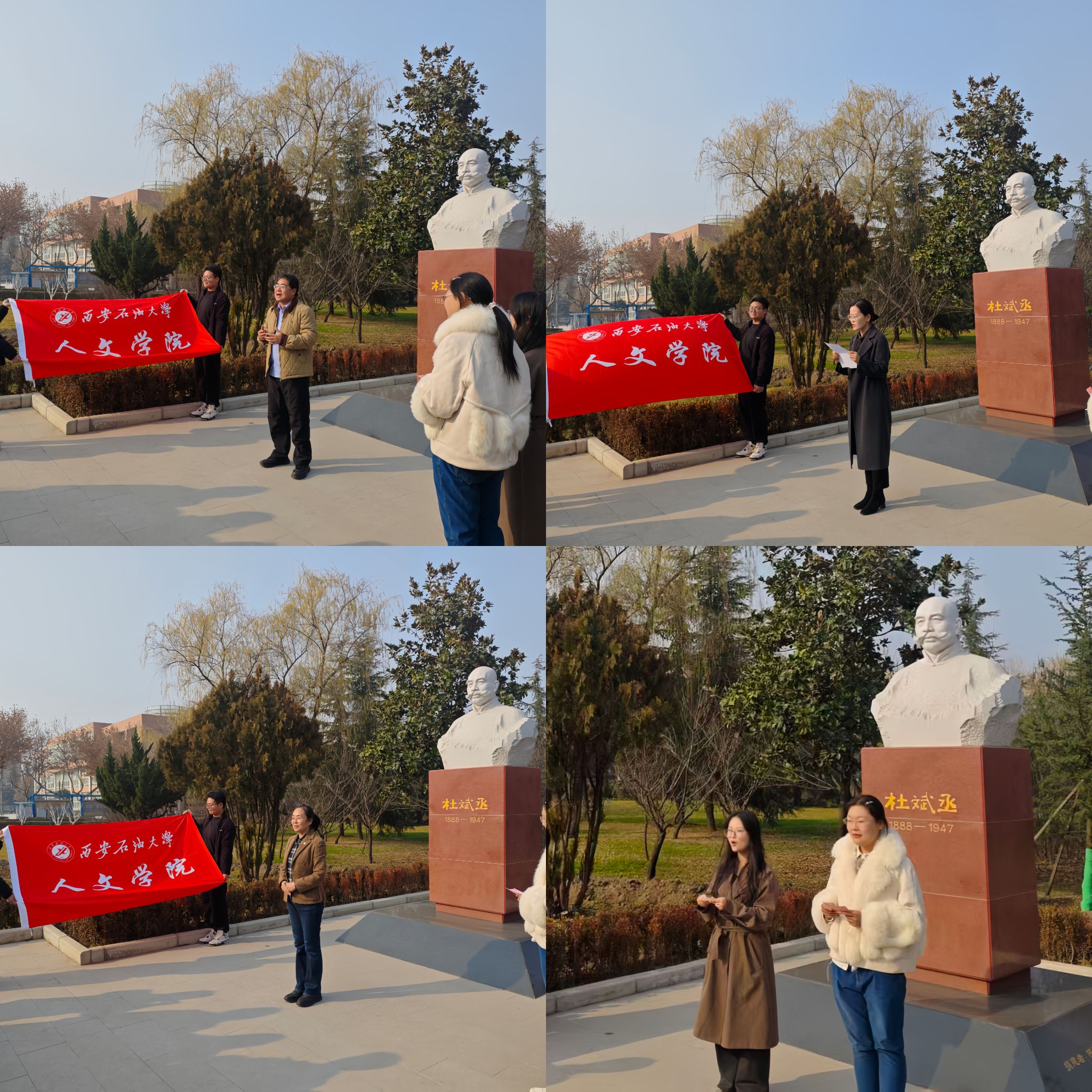 2025年12月11日下午,人文学院在杜斌丞烈士雕像前举行纪念杜斌丞烈士主题诗歌诵读活动。2024级汉语言文学专业全体同学参加,牟徐徐、杨雨婷两位同学主持。