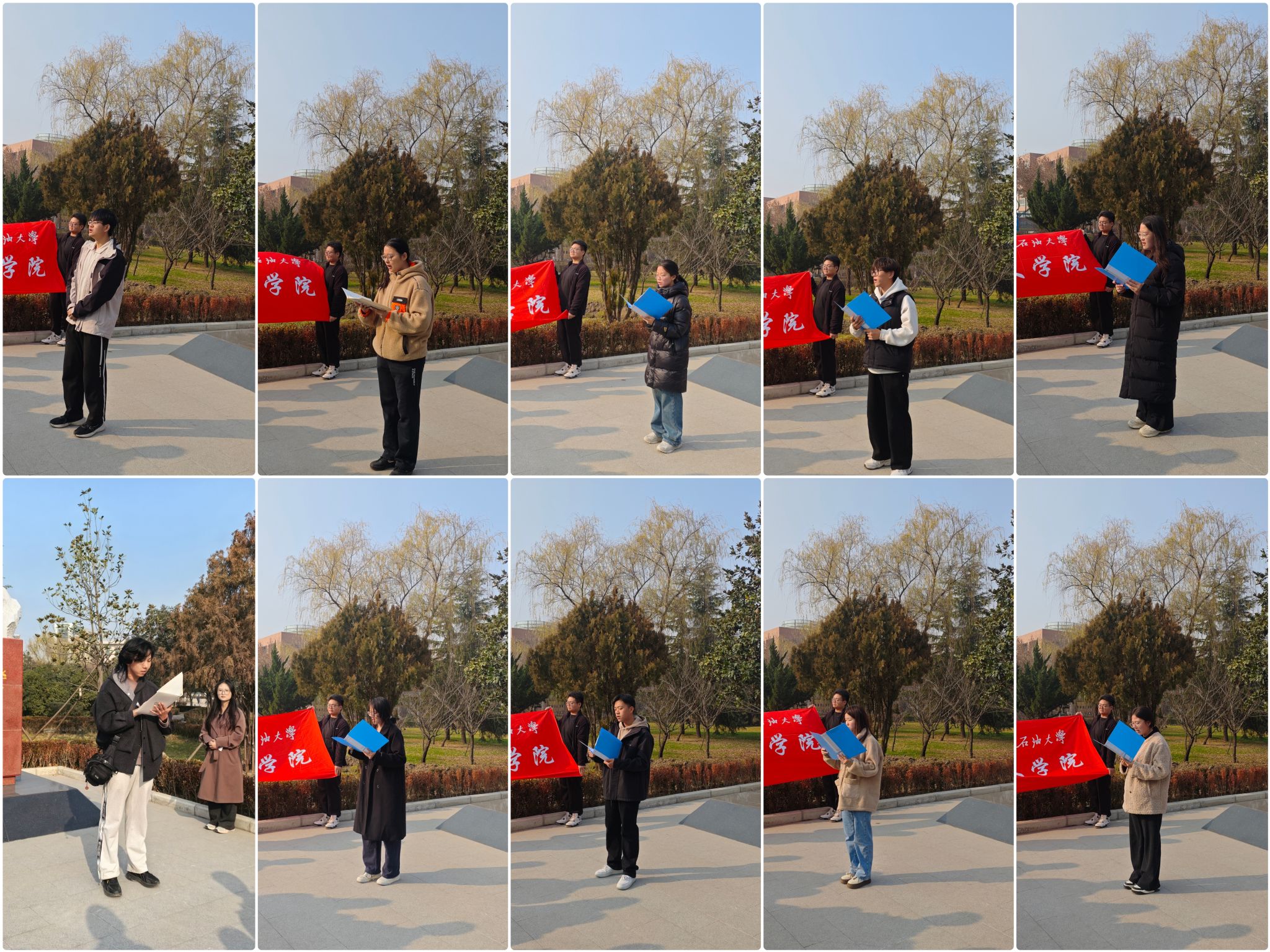在诵读环节,来自中文2401班的石浩然、路斯洋、张天缘、袁清泉、韩景怡、宁熙典,以及中文2402班的姜丁楠、马璟泽、董资昕、刘思雨等10位同学依次登台,用饱含深情的语调朗诵自己创作的主题诗歌。同学们的作品或追忆先生榆林办学的艰辛历程,或赞颂其面对独裁势力的铮铮铁骨,或抒发传承先生精神的青春誓言,字字铿锵、句句肺腑,将对革命先辈的崇敬之情化作回荡在雕像周围的真挚声浪,让在场师生深受感染。