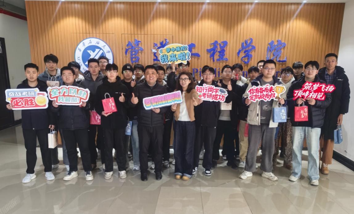 为鼓舞考研学子士气,坚定备考信心,缓解冲刺阶段的压力,营造温暖、向上的学习氛围,12月15日,管道工程学院精心组织开展了2026届毕业生考研冲刺动员暨慰问活动。学院党委副书记高亮深入学生宿舍走访慰问,并主持召开考研学子座谈会,为正在紧张备考的同学们送上学院的深切关怀与诚挚祝福。