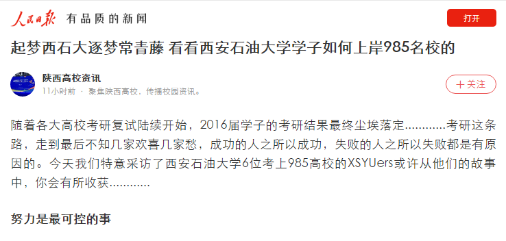 经验总结:这次难忘的复试经历让我收获了很多,也反思了很多。在我看来,能够支撑我走到最后的优势是相比常人更为丰富的实践经验:大一到大三这几年,在党委宣传部新媒体中心为官微撰写推文的经历让我熟练掌握了新媒体公众号的运营技能。得益于官微的平台之大,我还有幸参加了陕西省省级的新媒体沙龙交流会,进一步学习到了高校自媒体的运营策略,这也直接助推了我的b站影视频道“-Funtime-”的诞生,让我对媒体的运营有了更加深切的体验。另外,大三下半学期我开始了在“腾讯大秦网”为期两个月的实习,为“吃货在西安”、“西安种草机”撰写美食、旅游类稿件。这所有的经历都让我对新闻学的实践更加得心应手,同时也产生了更加深度的热爱。