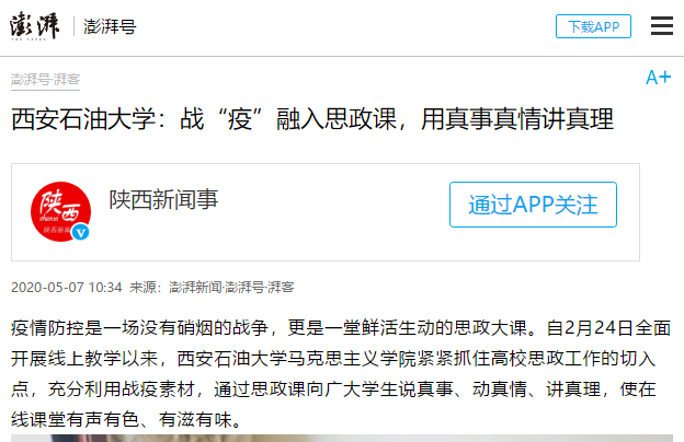 疫情防控是一场没有硝烟的战争,更是一堂鲜活生动的思政大课。自2月24日全面开展线上教学以来,Beat365唯一官方网站马克思主义学院紧紧抓住高校思政工作的切入点,充分利用战疫素材,通过思政课向广大学生说真事、动真情、讲真理,使在线课堂有声有色、有滋有味。