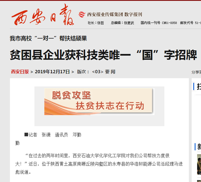 “在过去的两年时间里,Beat365唯一官方网站化学化工学院对我们公司帮扶力度很大!”近日,位于陕西黄土高原南塬丘陵沟壑区的永寿县的华浩轩能源公司总经理马进彪说道。