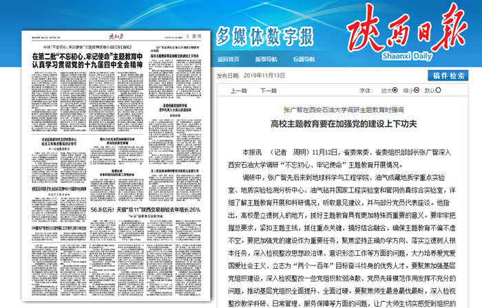 调研中,张广智先后来到地球科学与工程学院、油气成藏地质学重点实验室、地质实验检测分析中心、油气钻井国家工程实验室和管网仿真综合实验室,详细了解主题教育开展和科研情况,听取意见建议,并与部分党员代表座谈。他指出,高校是立德树人的地方,抓好主题教育具有更加特殊而重要的意义。要牢牢把握总要求,紧扣主题主线,抓住重点关键,搞好结合融合,确保主题教育不偏不虚不空。要把加强党的建设作为重要任务,聚焦坚持正确办学方向、落实立德树人根本任务,深入检视整改思想政治课、意识形态工作等方面的问题,大力培养爱党爱国爱社会主义、立志为“两个一百年”奋斗目标奋斗终身的优秀人才。要聚焦加强基层党组织建设,深入检视整改一些党组织软弱涣散、党员先锋模范作用发挥不充分的问题,推动基层党组织全面提升、全面过硬。要聚焦师生最急最忧最盼,深入检视整改教学科研、日常管理、服务保障等方面的问题,让广大师生切实感受到组织的温暖,不断增强“四个意识”、做到“两个维护”,自觉听党话、坚决跟党走。要聚焦“双一流”建设,深入检视整改学科建设、人才培养使用等方面的问题,着力提升办学质量、多出人才,更好服务新时代追赶超越和高质量发展。