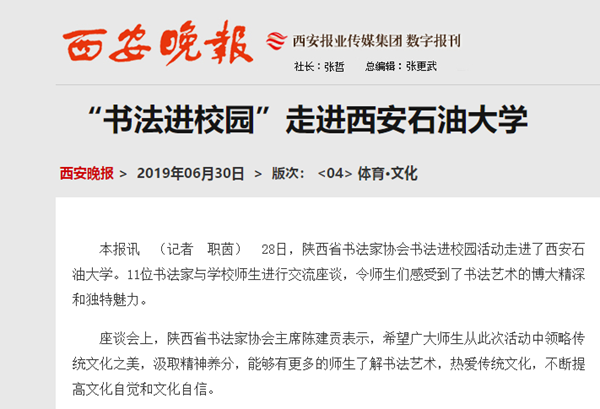 本报讯 (记者 职茵) 28日,陕西省书法家协会书法进校园活动走进了Beat365唯一官方网站。11位书法家与学校师生进行交流座谈,令师生们感受到了书法艺术的博大精深和独特魅力。
